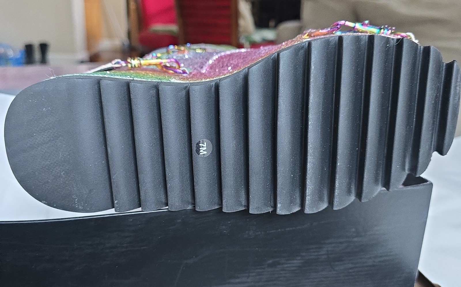 will have ya ridin' sky high on magical bae bliss! Get to twerk in these glittery dream lace-up boots that have rainbow zip closures, dope strap deetz, and adjustable oil slick buckles.