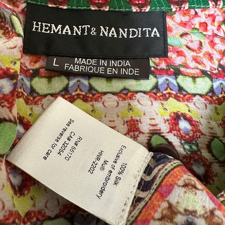 HEMANT & NANDITA Tassel Hem Beaded Geo Print Short Sleeve Silk Tunic Dress. Women's Size Large. Vibrant all over geometric print accented with beads and green tassels at the hem. Pullover design with button v-neck. No pockets. Unlined. Flowy and elegant. Excellent condition. No visible flaws. Smoke-free home.