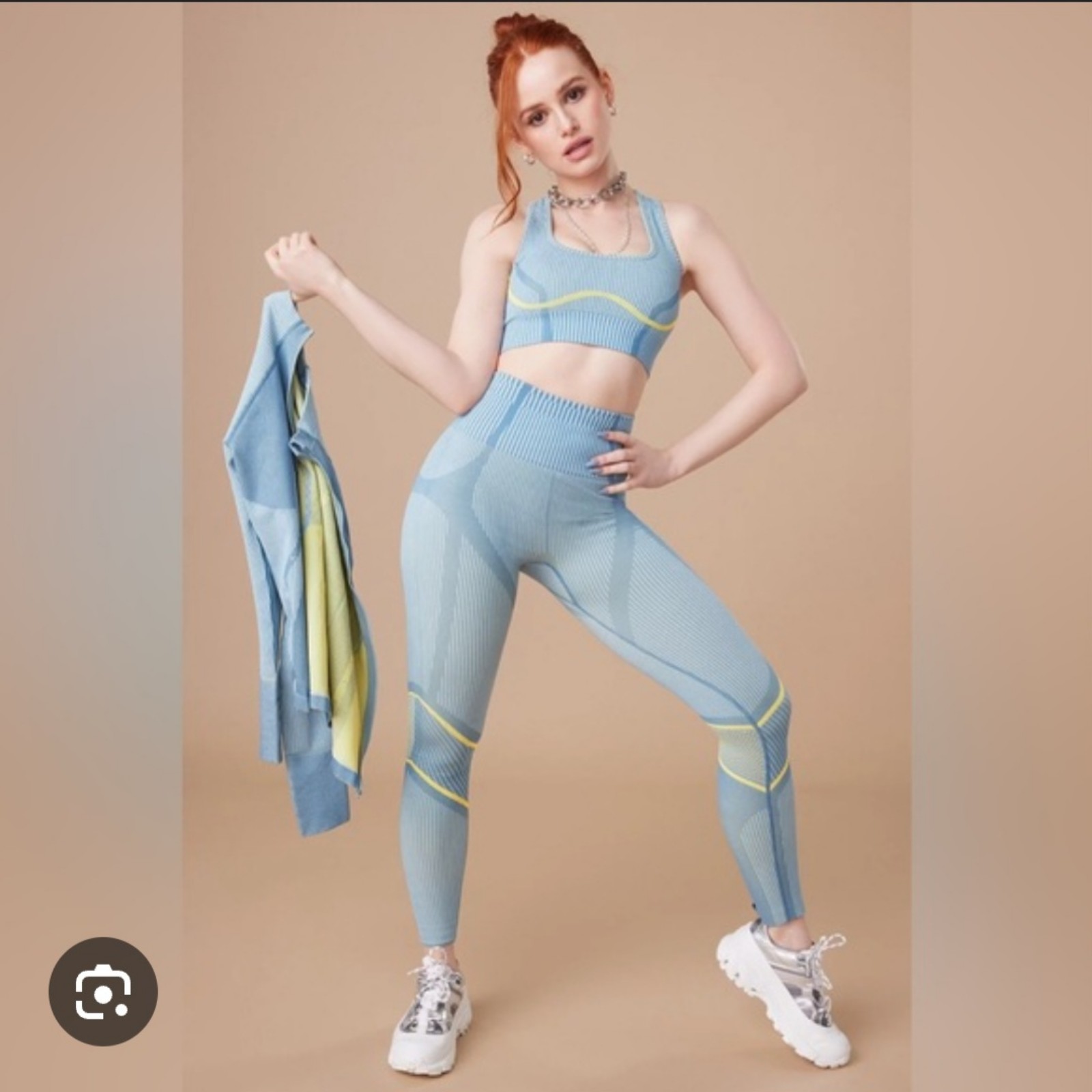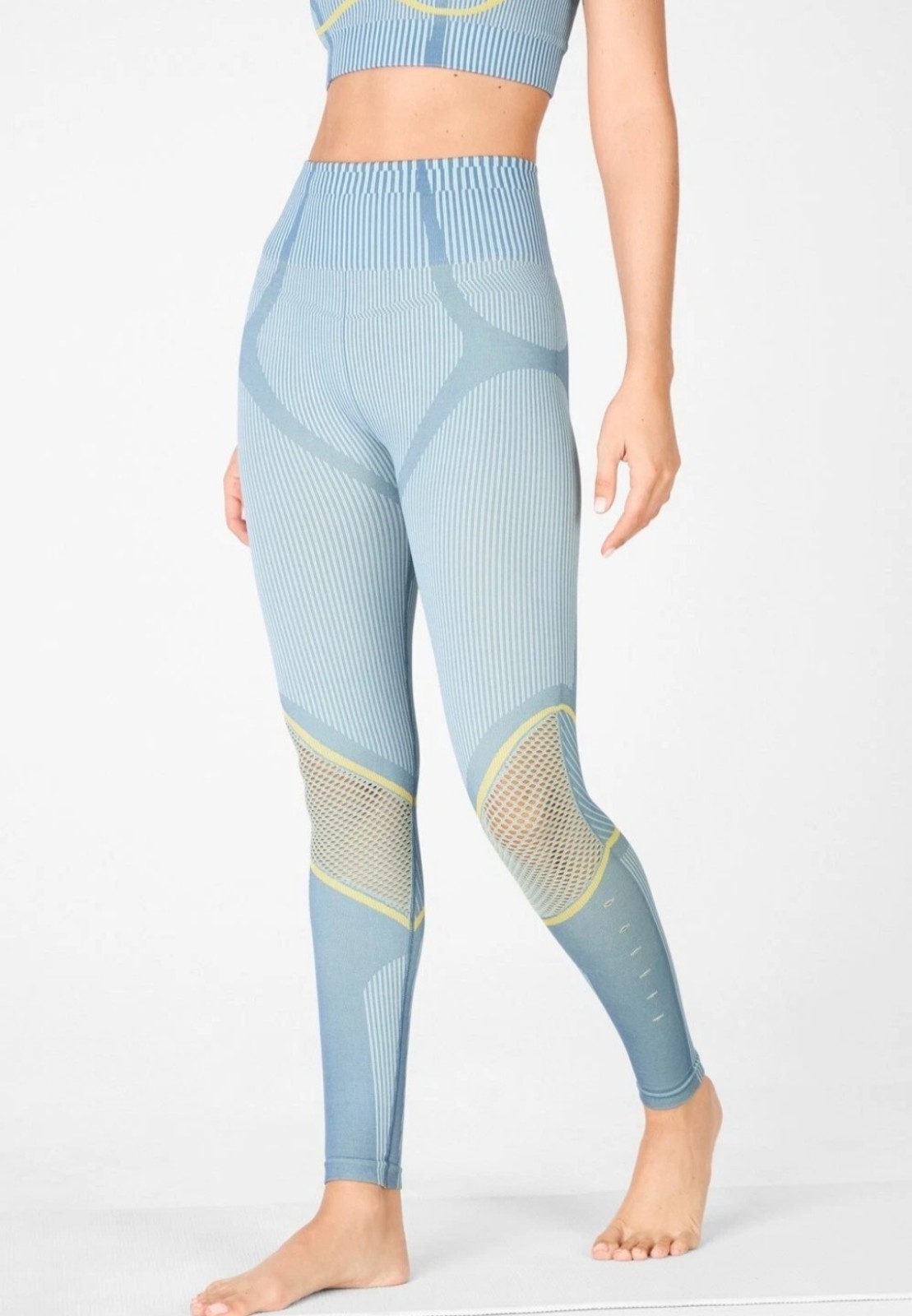 NWOT Fabletics x Madelina Petch collection (2021) high-waisted seamless leggings with mesh at the knees. blue and yellow color size XS