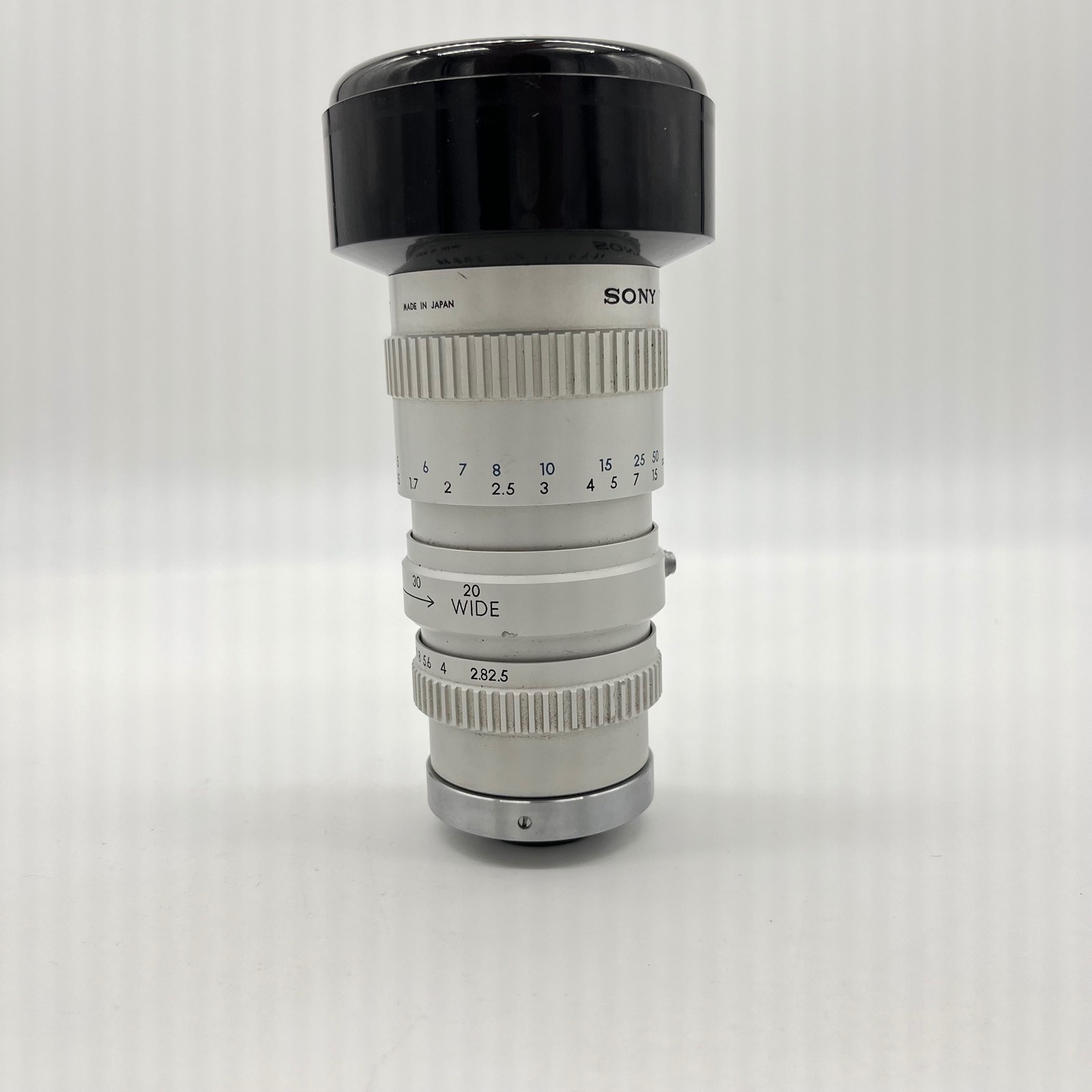 Vintage Sony TV Zoom Lens, a well-preserved piece of camera equipment with the product name clearly labeled on the body. The lens is marked with a focal length of f=20-80mm and an aperture of 1:2.5. It features multiple adjustable rings for focusing and zooming, each marked with numerical scales in both feet and meters to help ensure precise adjustments. The lens also has a serial number, No. 167827, and is labeled as "Made in Japan", indicating its manufacturing origin. The lens includes a lens cap with the Sony logo. This vintage lens is a find for camera collectors and those interested in retro photography equipment. In great condition! Smooth movement.