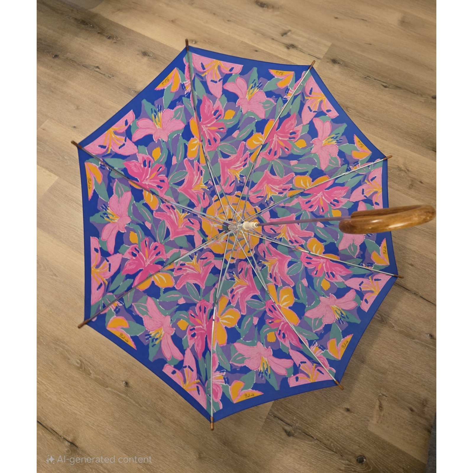 Vintage Ken Done Umbrella – Lilies Print – Wooden Handle – Rare