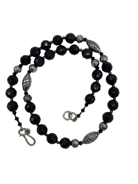 Gorgeous faceted black onyx gemstone beads with 925 sterling silver oval carved station beads and round spacer beads. There is a hand hammered hook closure. The necklace weighs 43.25g and measures 20 inch total length. This is an outstanding necklace very well made and substantial. Comfortable length to wear. Beautiful gemstones. This necklace is unmarked, but I have tested the all the beads. The silver beads test at 925 sterling silver and the onyx is genuine. A fabulous addition to your collection.